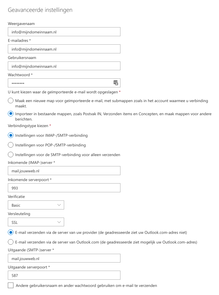 ⚠ Merk op: Het te gebruiken wachtwoord is het wachtwoord dat je specifiek hebt gekozen voor je mailbox en dus anders dan het wachtwoord waarmee je inlogt op JouwWeb zelf. Mocht je deze vergeten zijn, dan kun je het wachtwoord van je mailbox wijzigen.