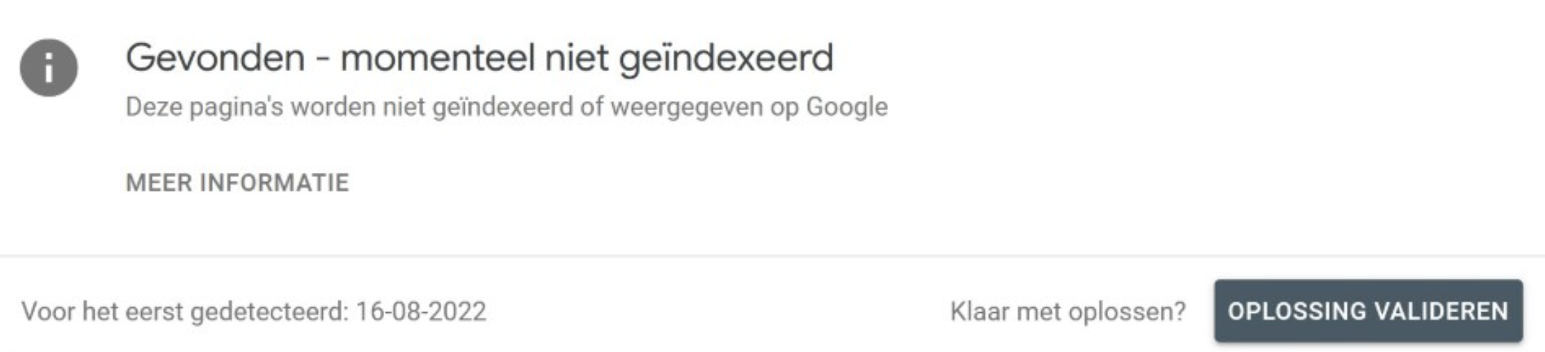 Het is dus heel belangrijk om in je Google Search Console te kijken naar "Gevonden-momenteel niet geïndexeerd". Zie zie je meteen of er pagina's zijn waarvan jij wilt dat ze gezien worden in de zoekresultaten.